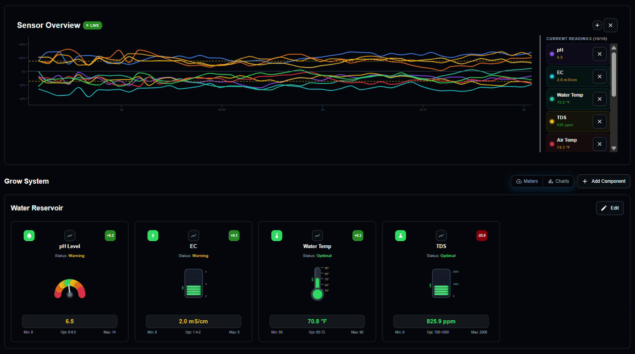 - Active grow monitoring and real-time tracking via API and user dashboard